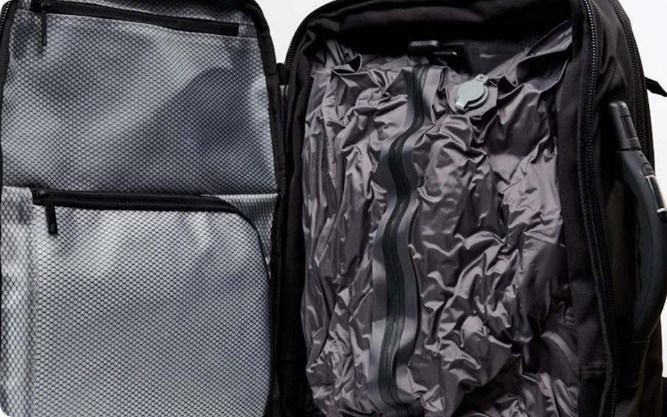 Dedicated areas for clothing, electronics, documents and travel accessories.